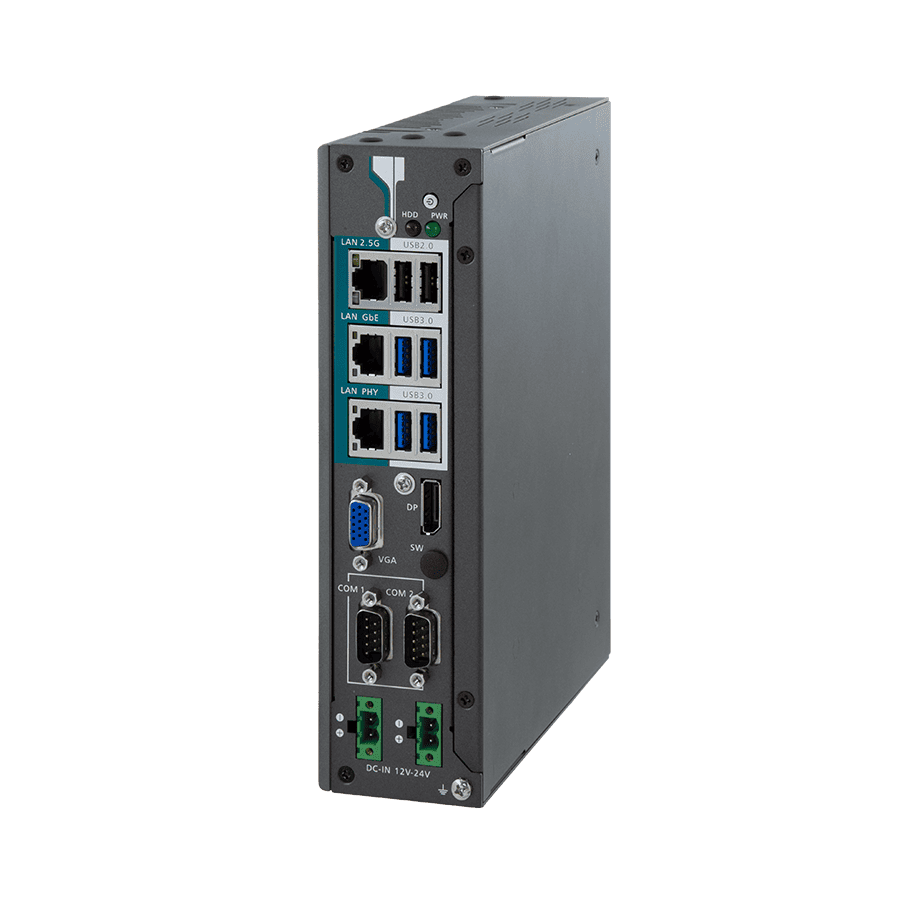 Fanless Embedded Din-Rail Box PC, Intel 12/13th Gen Core i3/i5/i7 CPU (35W Max), H610E Chipset, Up to 32GB DDR5 RAM, DP/VGA, 1x2.5GbE LAN, 2xGbE LAN, 4xUSB 3.2, 2xUSB 2.0, 2xUSB 2.0 Int., 2xCOM, 1xMiniPCIe, 1xM.2 Key-M, 1xM.2 Key-E, 12-24VDC-In, R1.0