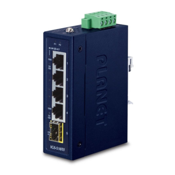 Industrial DIN-Rail Gigabit Unmanaged Ethernet Switch, 4x1000Base(T) + 1x1000 SFP Ports, 6KV DC protection, dual 12-48VDC/24VAC Input Voltage, -40..+75C Operating Temperature