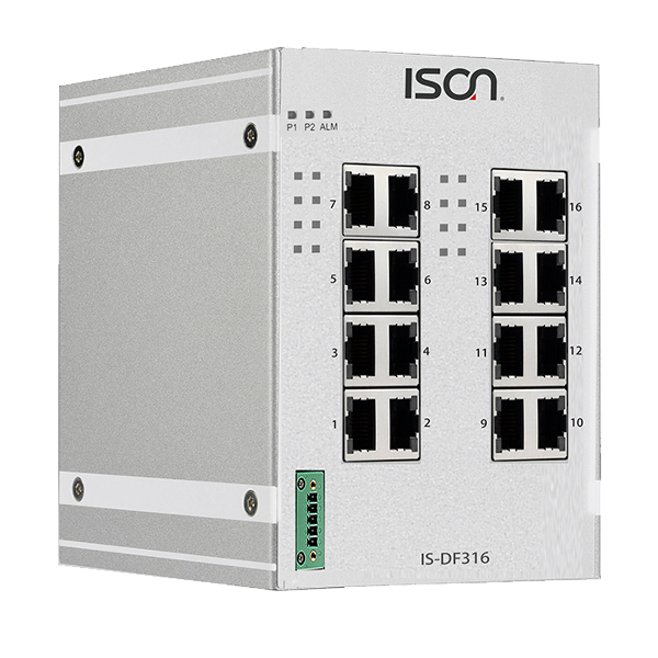 Industrial DIN-rail Unmanaged Layer 2 16-port Switch with 16x 100 Base-TX ports with 2kV isolation, -40...+75C operating temperature, Dual 12-58V DC In