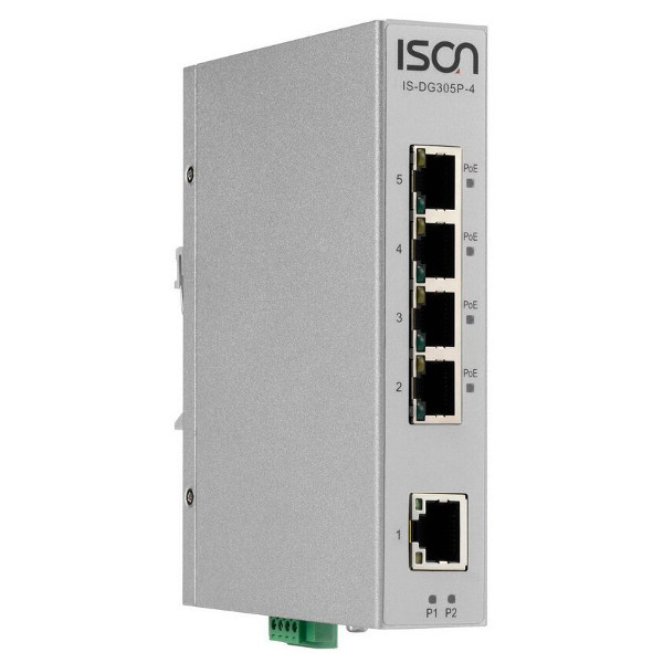 Industrial DIN-Rail Unmanaged 5-port IEEE802.3af/at Power-over-Ethernet Switch with 5x 1000Base-TX ports, 4 PoE output(max. 30W per Port), -40...+75C operating temperature, Dual DC