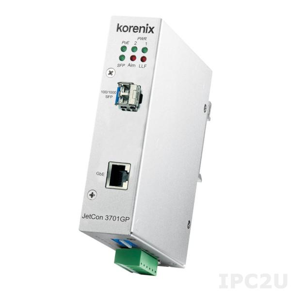 Industrial PoE Media Converter, 1x1000 Base TX, 1x1000 SFP port, 90W PoE budget, redundant 44-57V DC, Oper. Temperature -40..+75C, EN50121-4