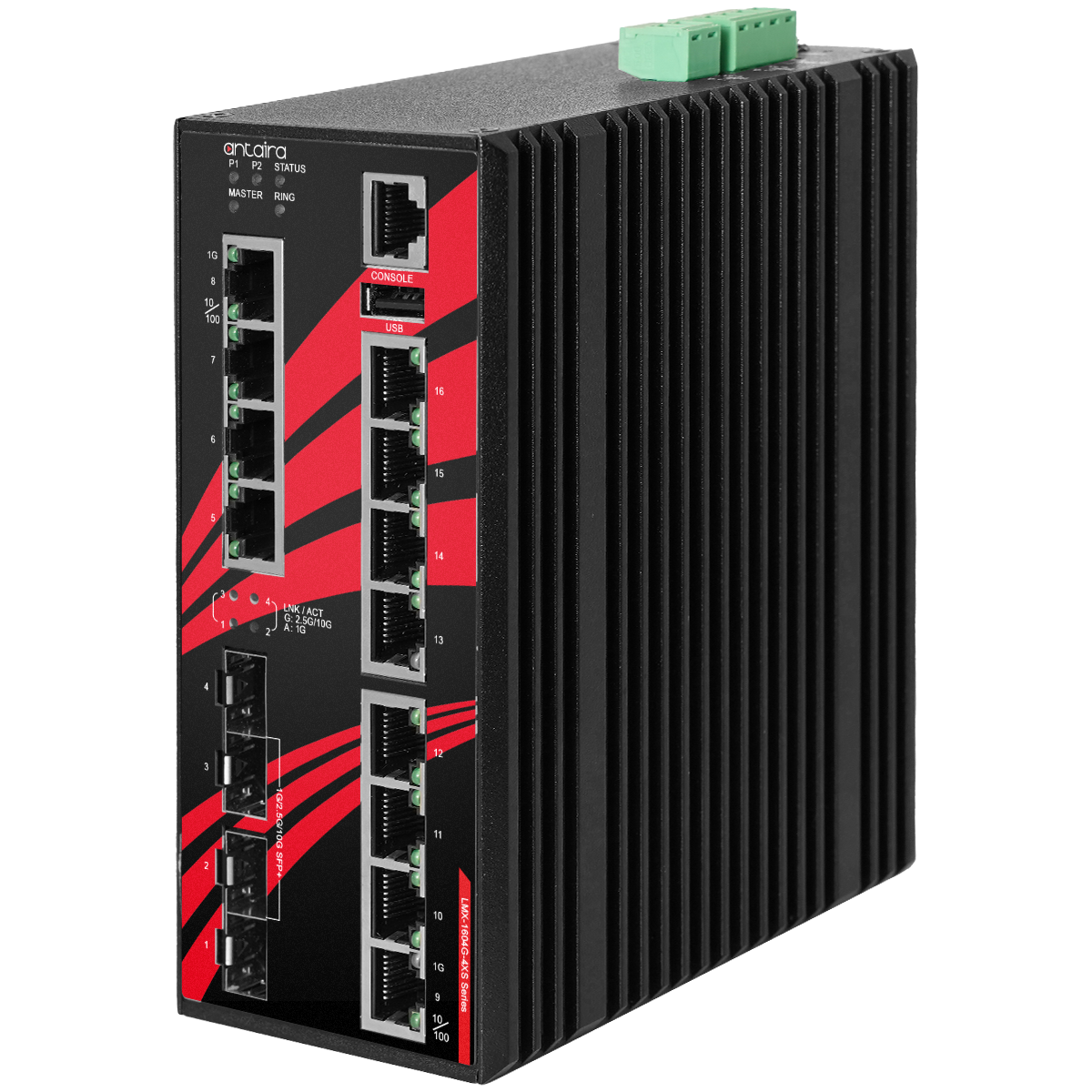 Industrial Layer 3 Managed Ethernet Switch, IP30, 12x10/100/1000Base-TX, 4x1G/2.5G/10GBase-X SFP, Power Input 12..48 VDC, Operating Temperature -10..65 C