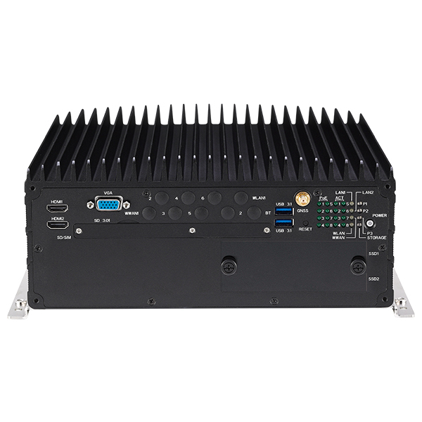 Embedded Railway Fanless PC Intel Core i7/i5/i3,Xeon 9,8th gen, 2xDDR4, VGA, 2xHDMI, 8xM12 PoE 802.3af/at, 2xM12 GbE, M12(2xUSB2.0), 2xUSB-A, DB15(CAN/DIO), DB9(audio), 3xCOM, U-blox M8N, 6xSIM, 2x2.5 SATA, 3xmPCIe, 2xM.2, SD, 24V/110VDC-in, -40..70C