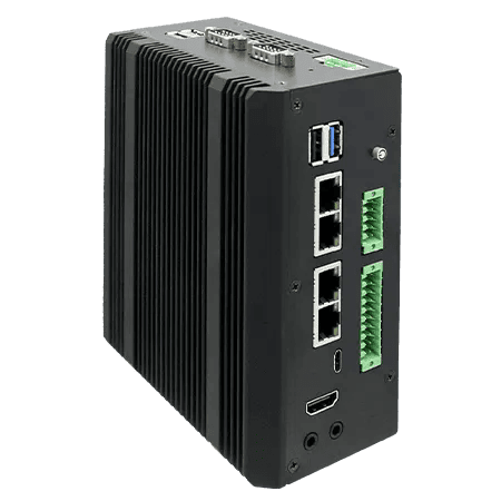 Fanless DIN-Rail AI Box PC, NVIDIA Jetson Orin Nano 6-core SoC, NVIDIA Ampere 1024-core GPU, 8GB LPDDR5 RAM, 256GB NVME SSD, HDMI, 3xGbE LAN, 1xPoE LAN, 3xUSB 3.2, 1xUSB-C, 1xUSB 2.0, 3xCOM, 16-bit DIO, 1xM.2 Key-B, 1xM.2 Key-E, 9-36VDC-in with PSU