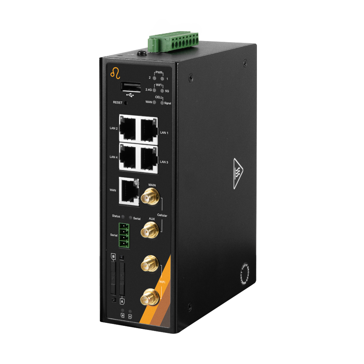 Industrial Cellular IoT Gateway, IP30, 4x10/100/1000Base-T RJ45, 1xCOM, 1xUSB, Dual SIM, 1xDI, 1xDO, 4xSMA, Dual 12..48VDC, Operating Temperature -30..70 C