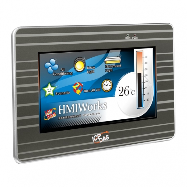 7" resistive touch HMI device with 32-bit RISC CPU, 64 MB SDRAM, 64 MB Flash, 2xCOM, 1xEthernet, PoE IEEE 802.3af, 12...48VDC-in, NEMA 4/IP65 Front