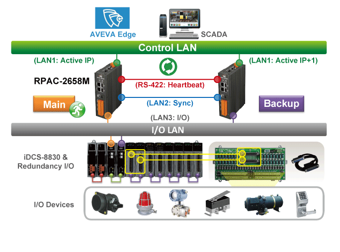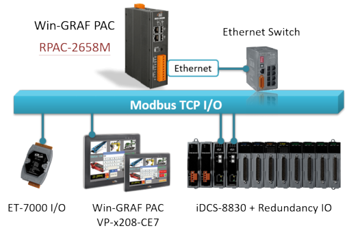 The RPAC-2658M can also be used in PCSs with internal redundancy. Here is an exemplary redundancy scheme with two RPAC-2658M PLCs connected to the redundant modular system iDCS-8830 with Ethernet. iDCS-8830 enables the redundancy of I/O, power and communication modules, and Modbus/TCP interface is provided for communication.